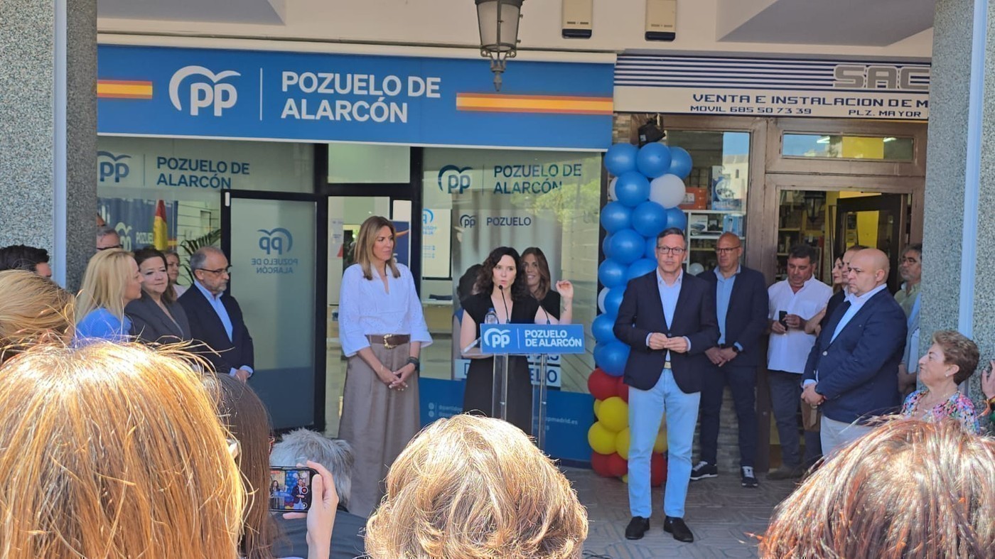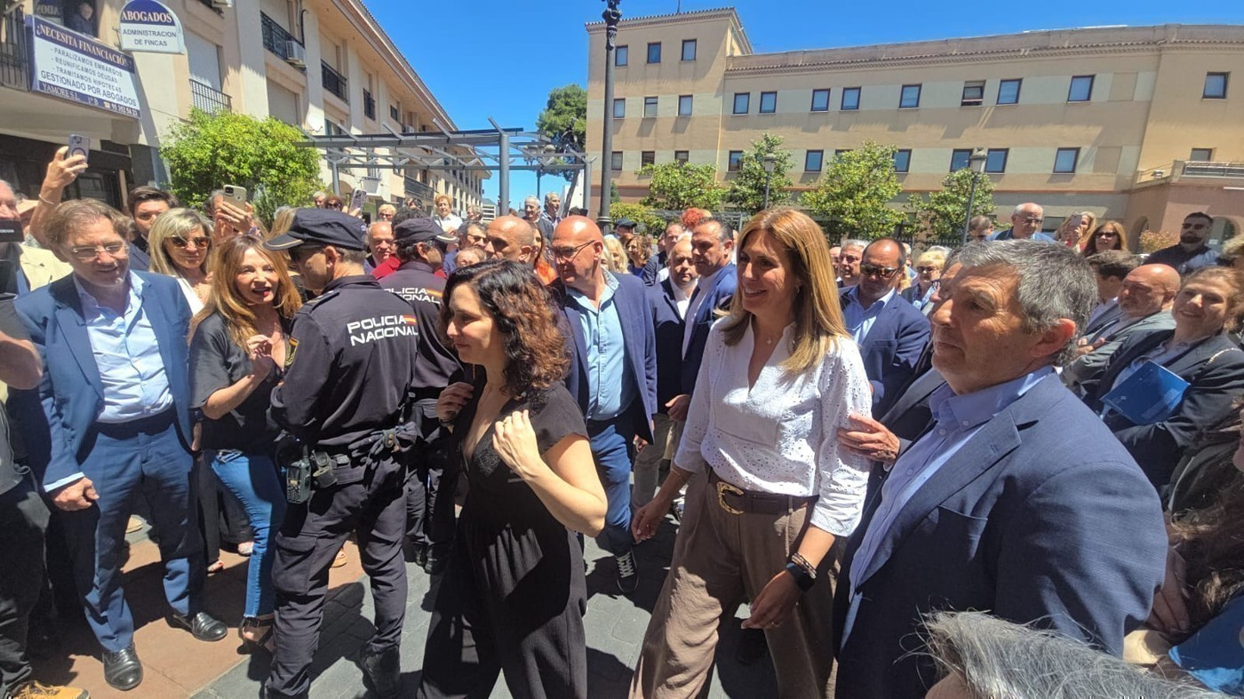 La presidenta de la Comunidad de Madrid, Isabel Díaz Ayuso, se dio un gran baño de multitudes en el acto de inauguración este viernes del nuevo cuartel general del PP pozuelero en la Plaza Mayor del pueblo.