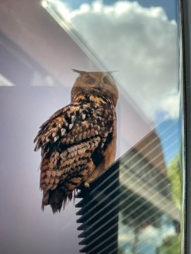 En un edificio de la calle Francia en Pozuelo de Alarcón, en una jardinera de uno de los balcones, ha anidado una pareja de Búhos, parece ser que reales. Al parecer llevan una semana.