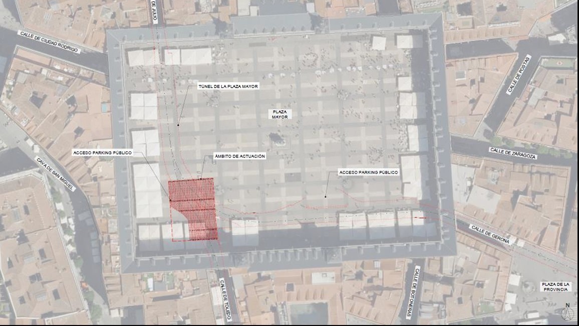 El túnel, de 593 metros de longitud, conecta las calles de Toledo y Atocha con San Felipe Neri. La rehabilitación actuará sobre el interior del túnel y sobre una superficie de unos 400 m2 en el suroeste de la plaza Mayor, donde se retirarán los adoquines, se demolerá la losa actual, se sustituirán las placas dañadas y se colocará una nueva losa impermeabilizada antes de recolocar el pavimento original.