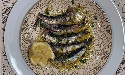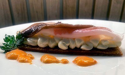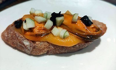 Mejillones con escabeche casero agridulce, ajo negro y manzana ácida