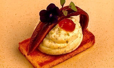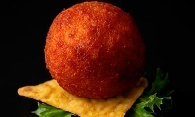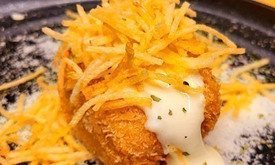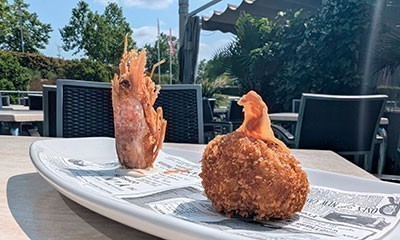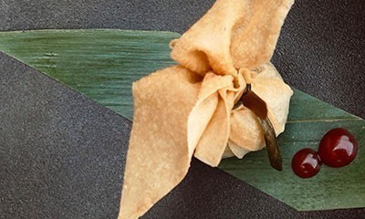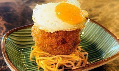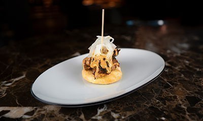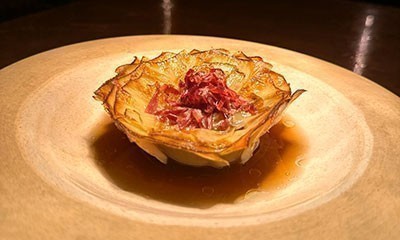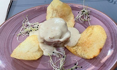 Croqueta de gambón al ajo negro con velo de papada ibérica