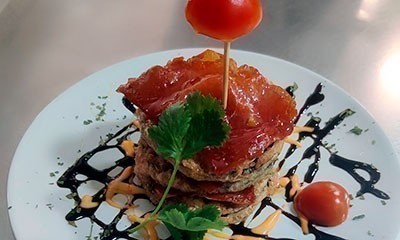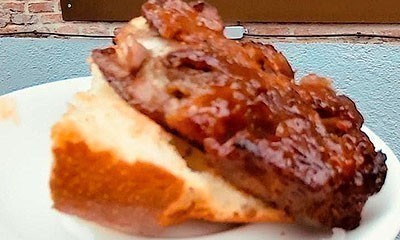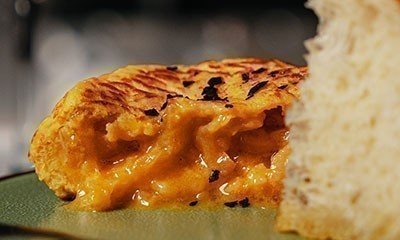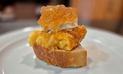 Pintxo de tortilla de patata con sobrasada y cebolla caramelizada
