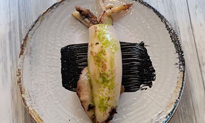 Alcachofas de Tudela en kokotxera a la parrilla con fondo ibérico