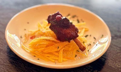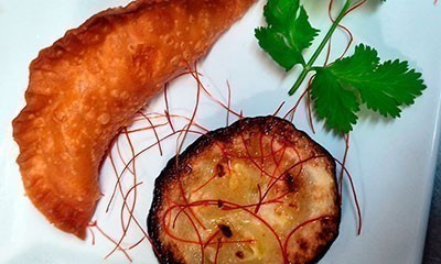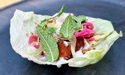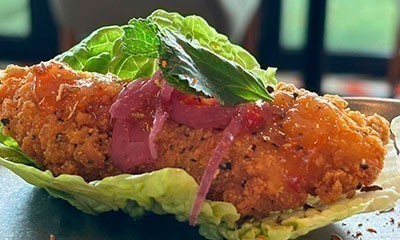 Saam de pollo campero maridado con sweet chil de ajo negro y jengibre