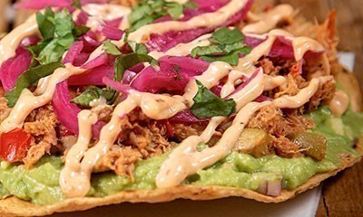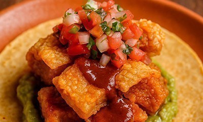 Taco de chicharrón con guacamole fresco, lechuga y pico de gallo