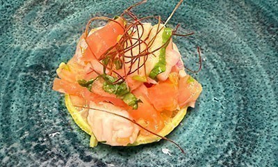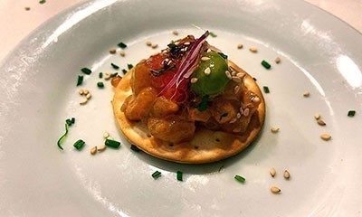 Cracker de salmón con barbacoa japonesa picante, hierbabuena y lima