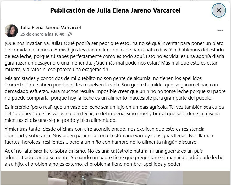 REDACCIÓN - “¡Que nos invadan ya! ¿Qué podría ser peor que esto?”. La frase, escrita en Facebook por la bloguera cubana Julia Elena Jareño Varcárcel, no es una llamada literal a la intervención extranjera, sino un grito cargado de ironía amarga. Un recurso extremo para describir una realidad que, según su testimonio, se ha vuelto asfixiante para millones de cubanos que siguen viviendo en la Isla.