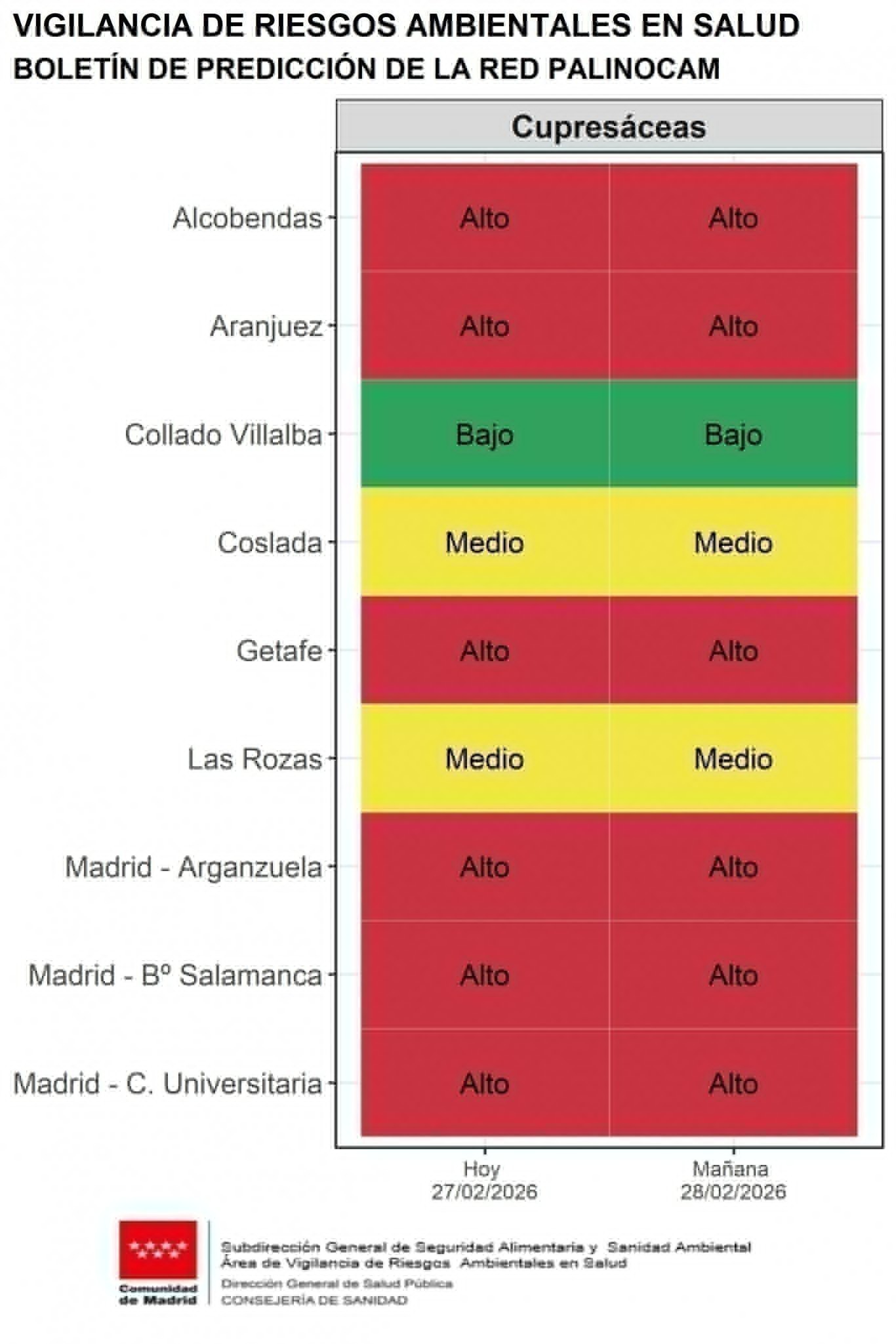 REDACCIÓN - Las consultas de alergología no dan abasto. Gran parte de la Comunidad de Madrid presenta nivel rojo por polen de cupresáceas, con registros que no se habían visto en los últimos 45 años.