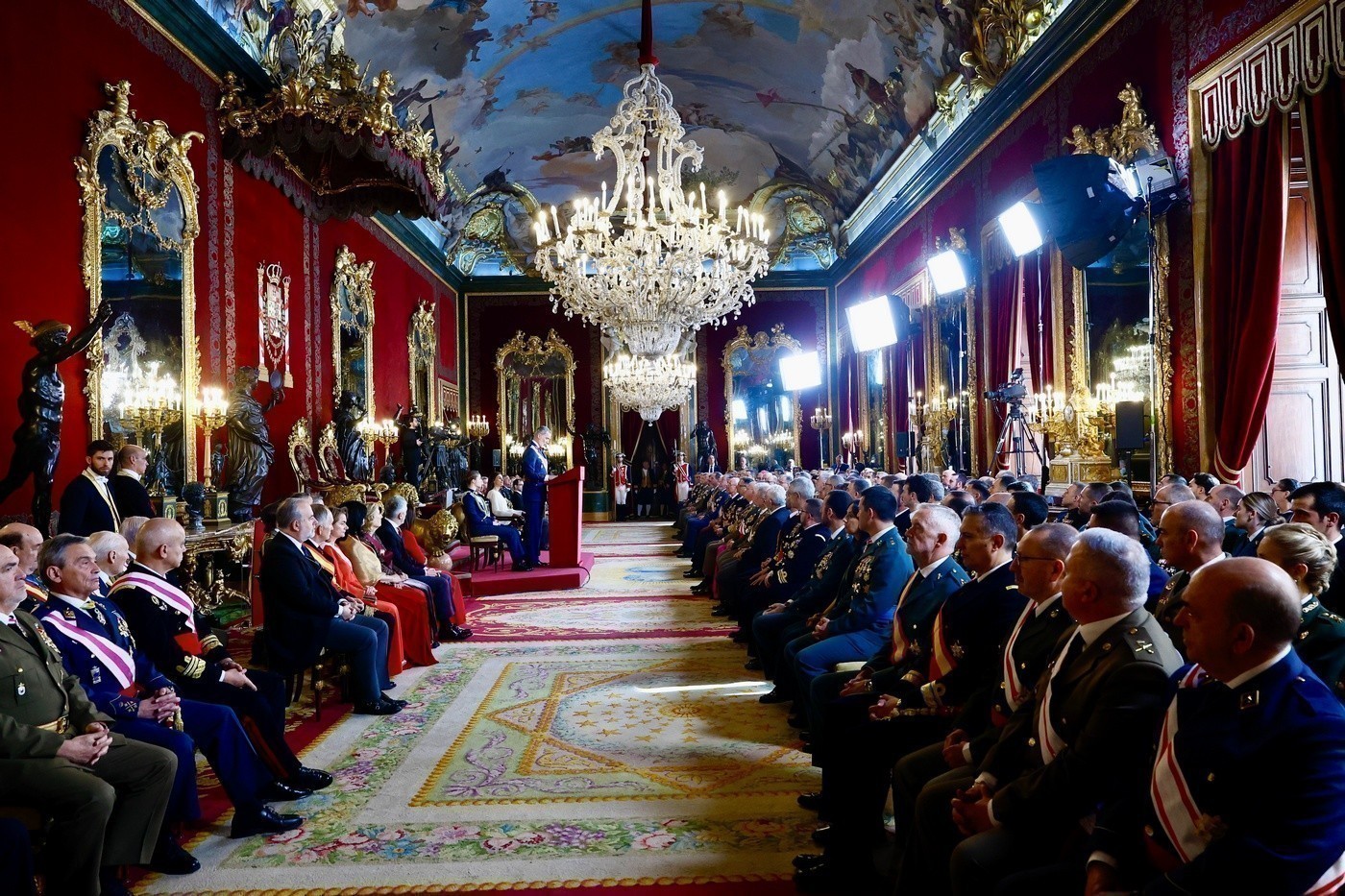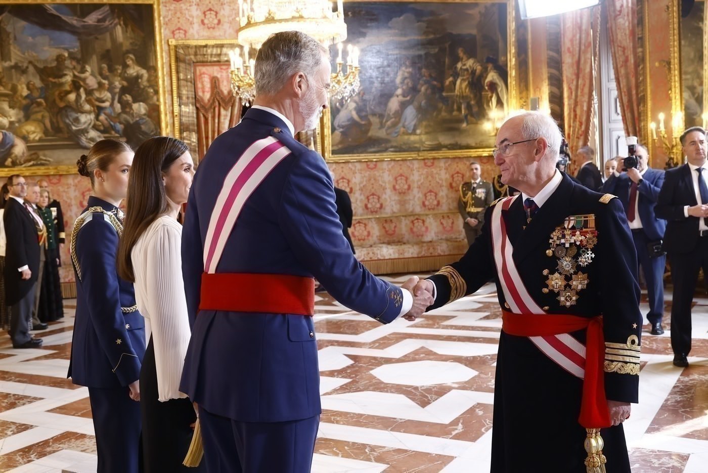Tras la revista, la comitiva real se dirigió por la Escalera de Embajadores hasta la Saleta de Gasparini, donde tuvo lugar el saludo a las distintas comisiones militares, un ritual que refleja la estructura y representación de las Fuerzas Armadas españolas.