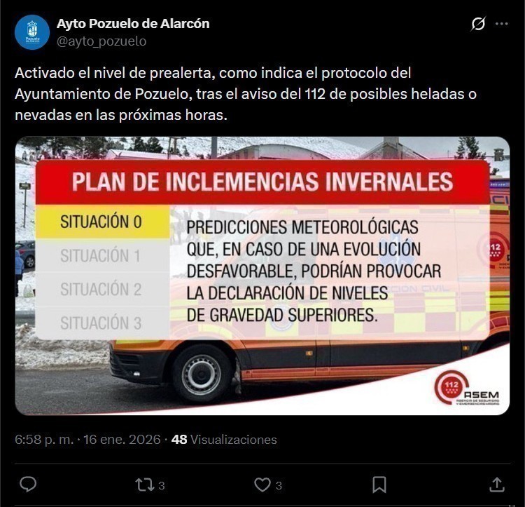 REDACCIÓN - El Ayuntamiento de Pozuelo de Alarcón ha activado el nivel de prealerta por inclemencias invernales, tal y como establece su protocolo municipal, tras el aviso recibido de la Agencia de Seguridad y Emergencias Madrid 112 ante la previsión de posibles heladas y nevadas en las próximas horas.