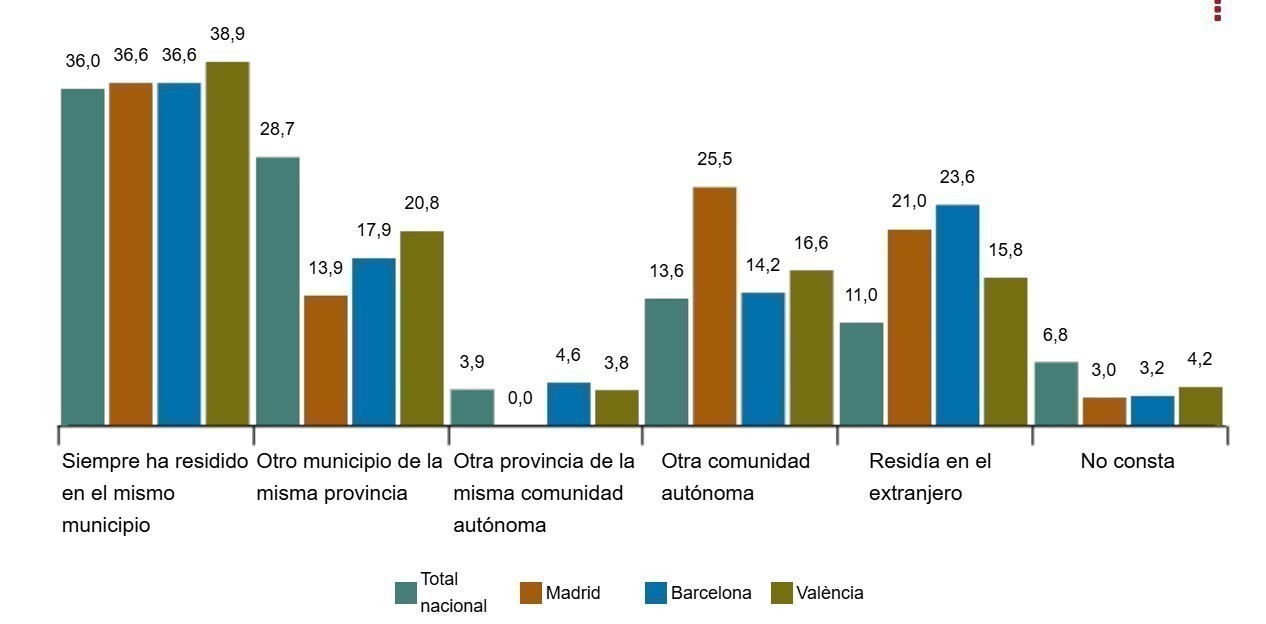 Relación entre residencia actual y anterior en 2024. Principales ciudades