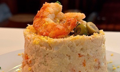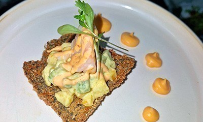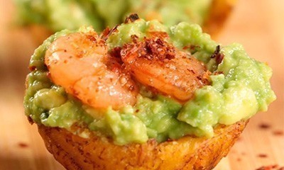 Tapa Ambigú: Tosta de patacón con guacamole y gambas al ajillo