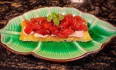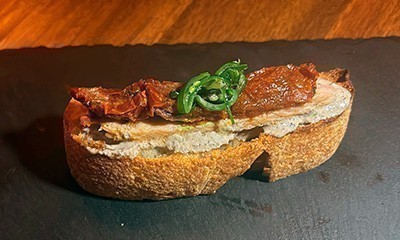 Tapa Da Morena: Tosta de ventresca, tomate seco y crema de aceituna negra