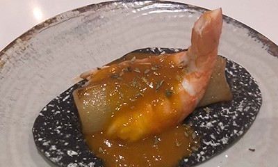 Tapa El Doble de Pozuelo: Puerro confitado con salsa de marisco y langostino