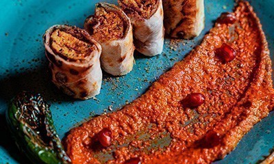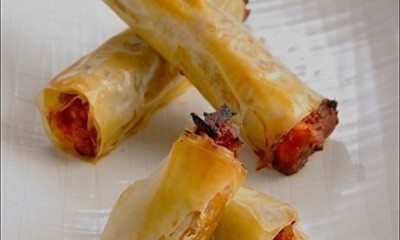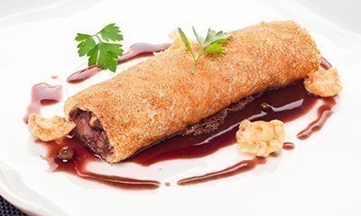 Tapa Parrilla Los Asturianos: Crepes rellenas de morcilla, pasas, manzana y piñones con reducción al Pedro Ximénez