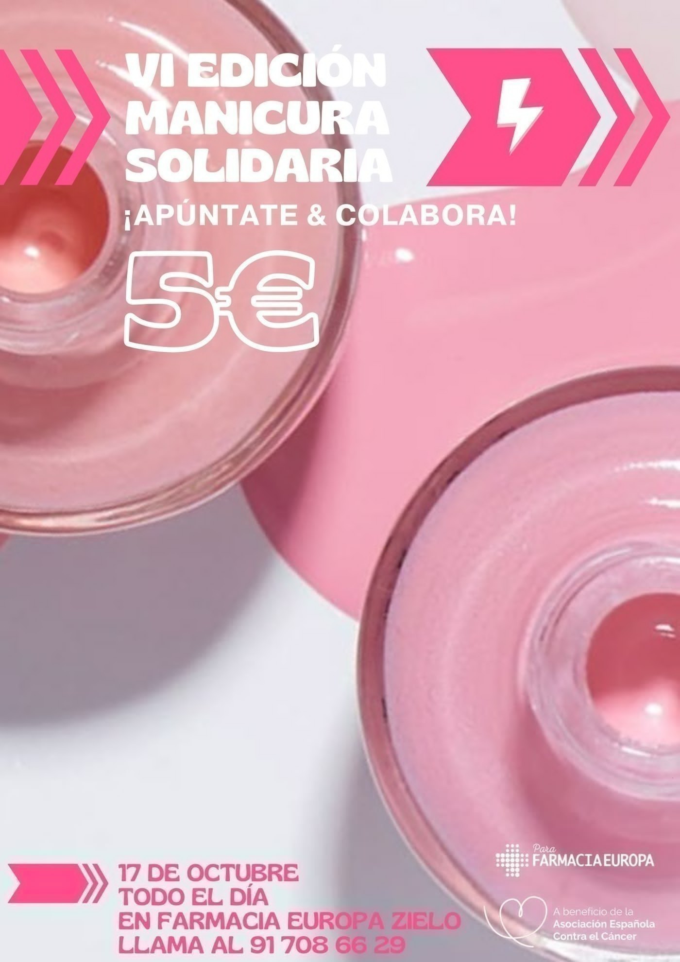 El viernes 17 de octubre, el color rosa se trasladará también a las manos con las Manicuras Solidarias, que se realizarán a lo largo de toda la jornada en Farmacia Europa Zielo. Por una aportación de 5 euros, que también irá destinada íntegramente a la AECC, los vecinos podrán participar en esta acción benéfica. Las reservas pueden realizarse llamando al 91 708 66 29.